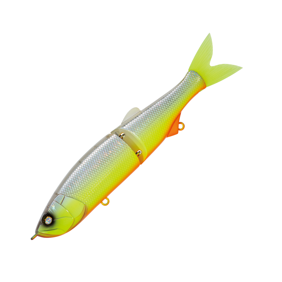 WHIPLASH FACTORY's first jointed lipless minnow. It swims seductively in a wide slalom with a short travel distance during retrieval, and its movement is also transmitted to your hand. With a light twitch, it darts left and right, and with fine continuous operation, it develops a writhing action under the water surface, driving the target crazy. The body thickness is set to 1.5 mm, assuming a strong target with teeth and jaws. The hook is one size larger than the general model of the same type, and the hook-up rate is also improved.