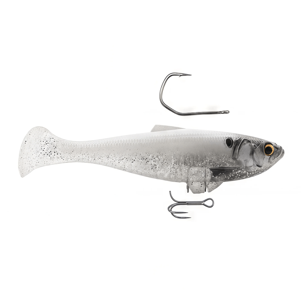 The SWAG LT Swimbait combines a wide, stable swim action with a versatile Over/Under Line-Through harness for dorsal or belly hook rigging. Built from 10X Tough ElaZtech®, it slides up the line on hookset to prevent thrown hooks. Features include a keeled tail, internal rattle, and twin clip keeper.